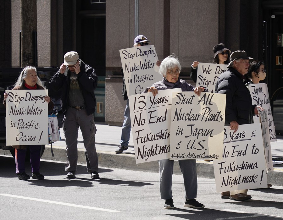People take part in a rally against Japan’s ocean discharge of Fukushima nuclear-contaminated wastewater in front of the Consulate General of Japan in San Francisco, California, the United States, March 11, 2024. (Photo by Li Jianguo/Xinhua)