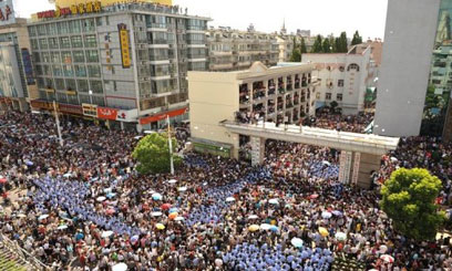But the crowds dispersed after local authorities used television, radio, the Internet and text message to announce that the waste water pipeline project at the mill, which belongs to Japanese company Oji Paper, would be “permanently cancelled”.