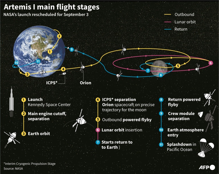 Outline of the nearly six-week Artemis 1 voyage © AFP/File / John SAEKI