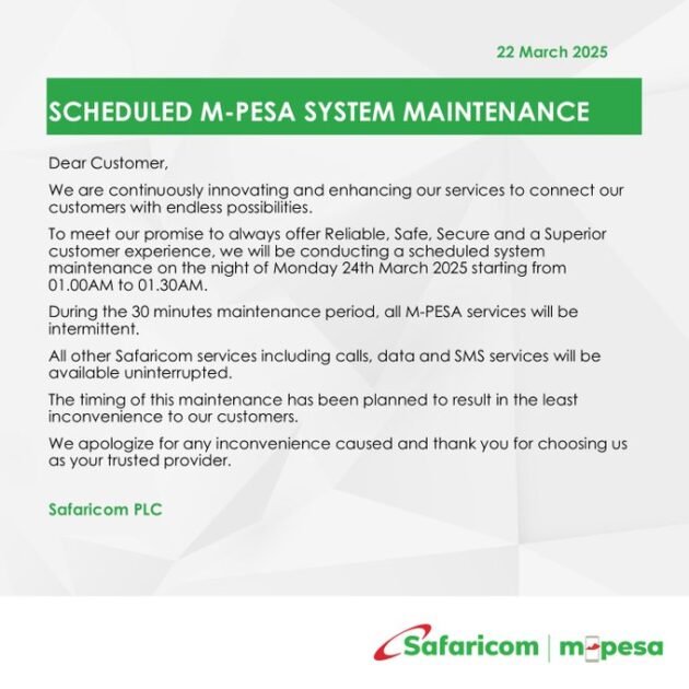 NAIROBI, Kenya, Mar 22 – Safaricom has notified its customers of an upcoming M-PESA system maintenance scheduled for Monday, next week.