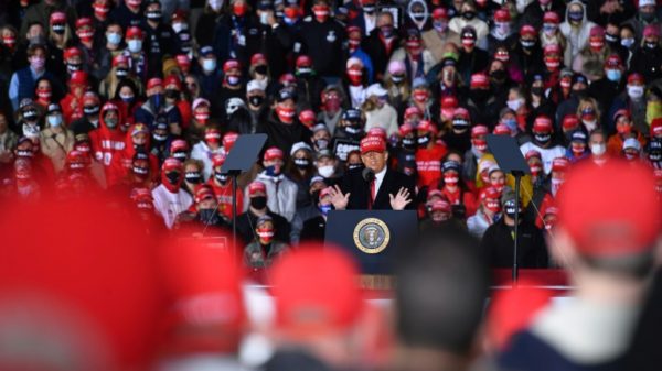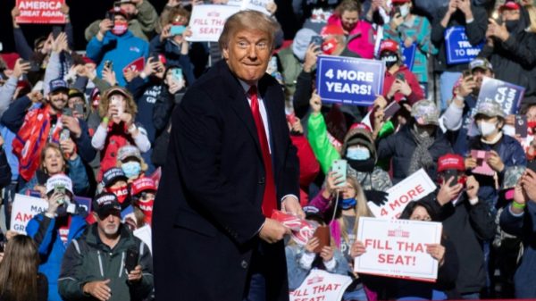 Janesville, United States, Oct 18 – President Donald Trump campaigned at a frenetic pace Saturday in a three-state trip that started with a Michigan...
