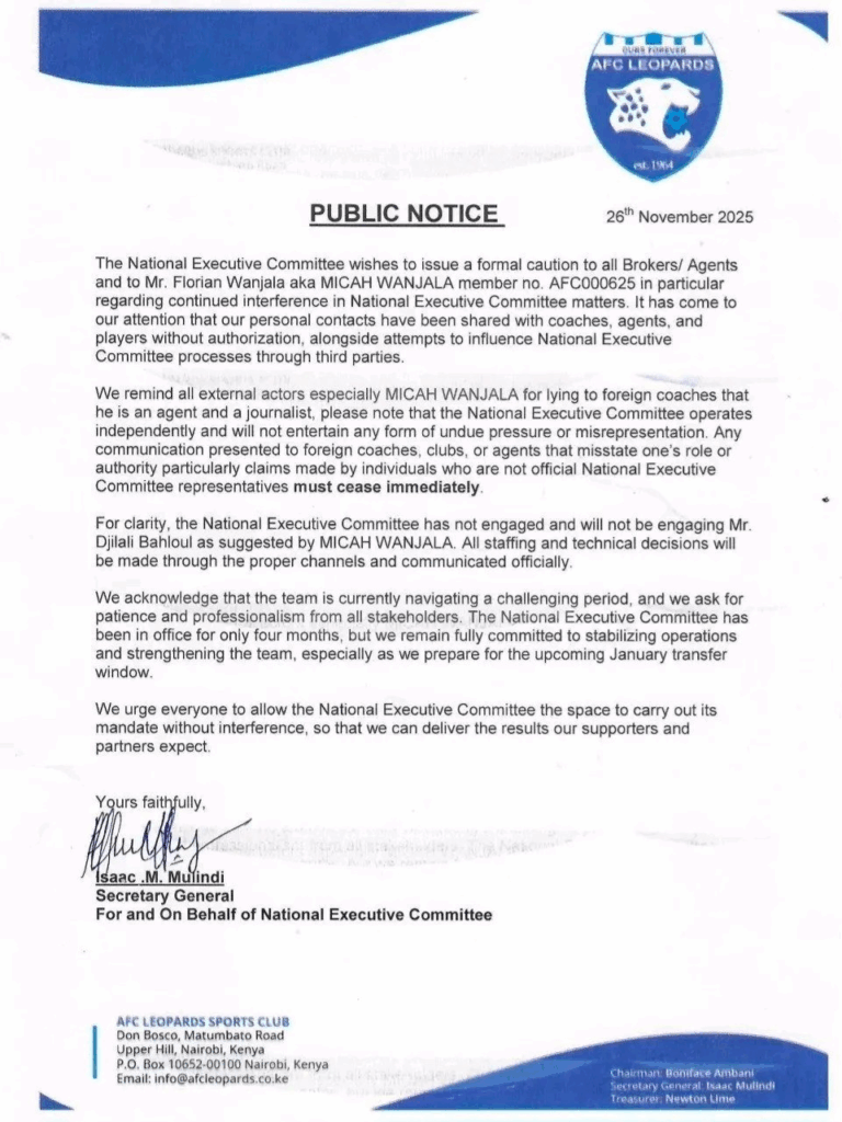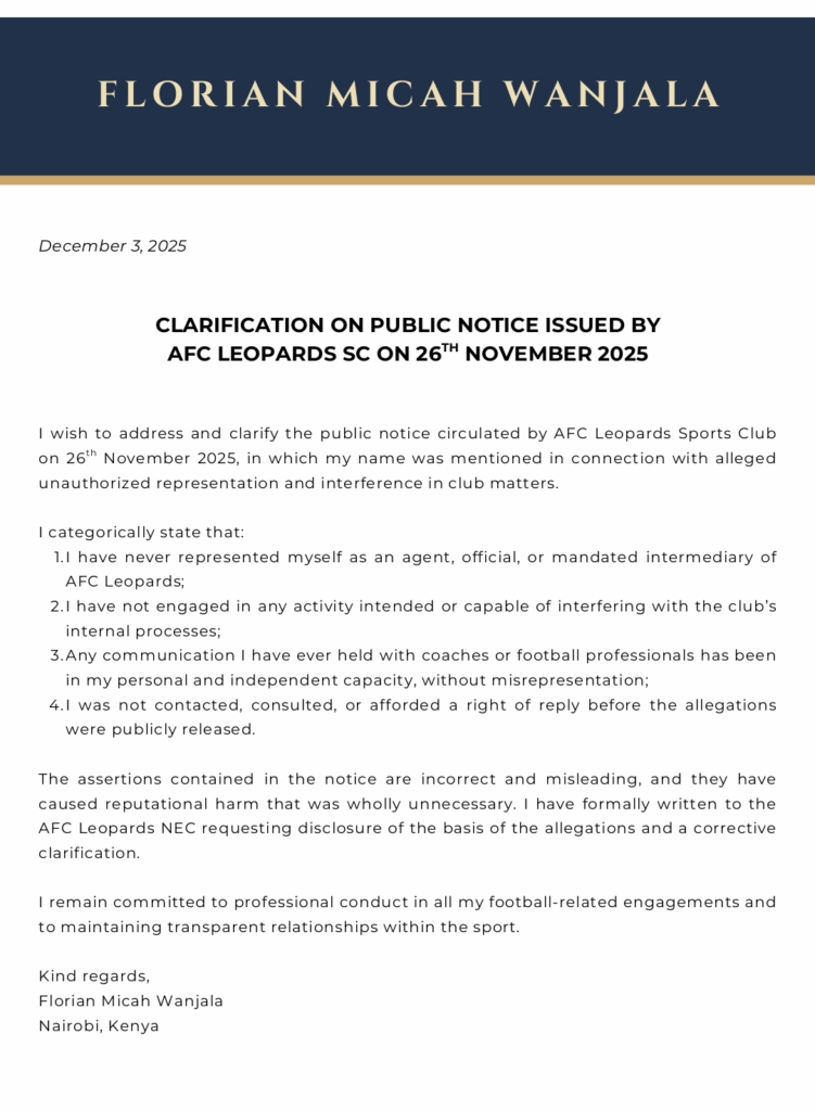 “I categorically state that: I have never represented myself as an agent, official or mandated intermediary of AFC Leopards. I have not engaged in any activity intended or capable of interfering with the club’s processes. Any communication I have ever held with coaches or football professionals has been in my personal and independent capacity, without misrepresentation,” Wanjala said.