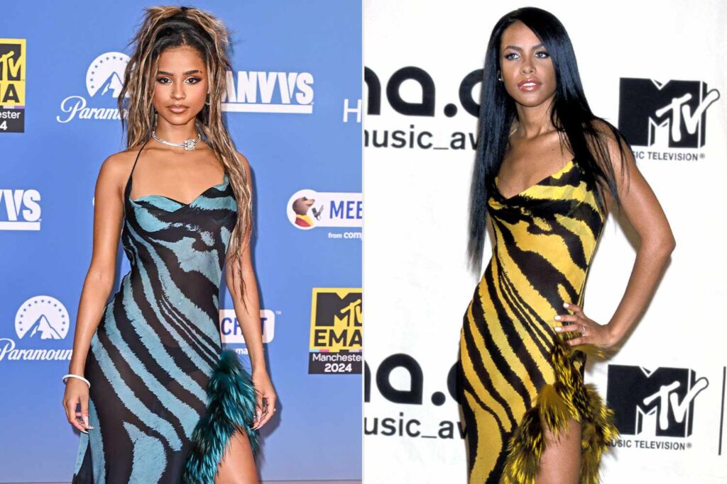 True to her admiration for the late icon, Tyla graced the ceremony wearing an outfit that paid homage to Aaliyah’s iconic Roberto Cavalli dress from the 2000 VMAs. Fighting back tears, she said, “The fact that I’m even winning this in her dress is like—oh my god.”