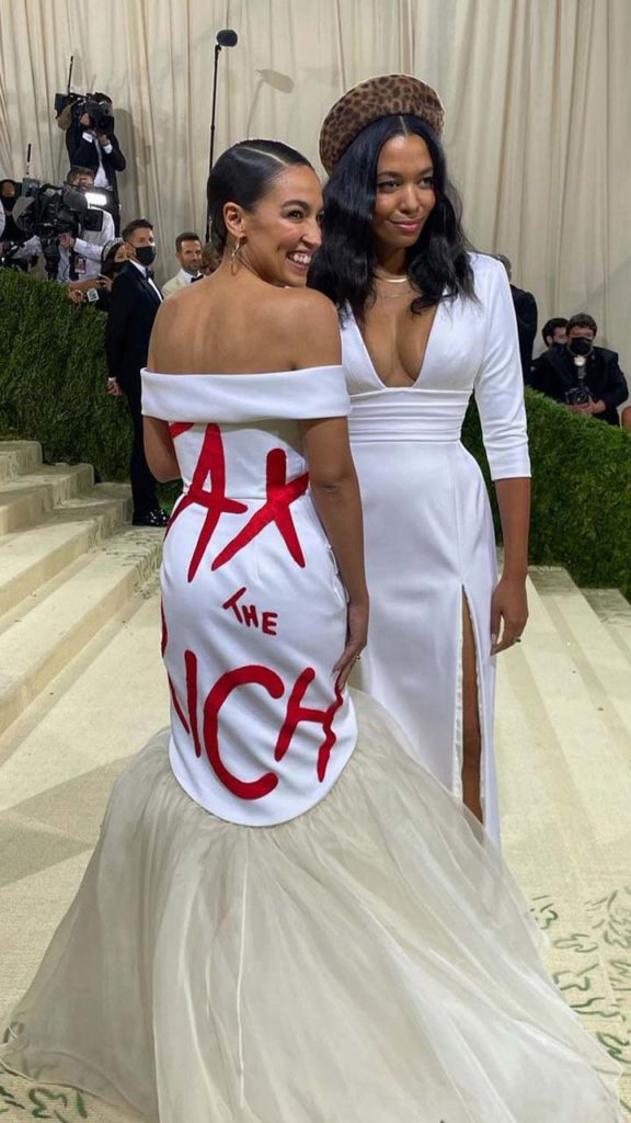On the other hand, Alexandria Ocasio-Cortez, a New York US representative, wore a white gown with the words ‘Tax the Rich’ boldly christened on it on the back. The Congresswoman’s Carolyn B dress was an ode to a historic moment for women’s rights in the US.